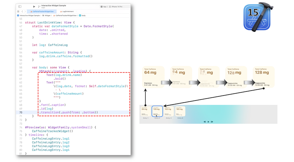 In Xcode, the widgets make animations work in a specific way while they have no State and subsequently create a timeline for selecting the different views: SwiftUI determines where the differences are for living up the altered parts with default or customized animations used as transitions in the previews.